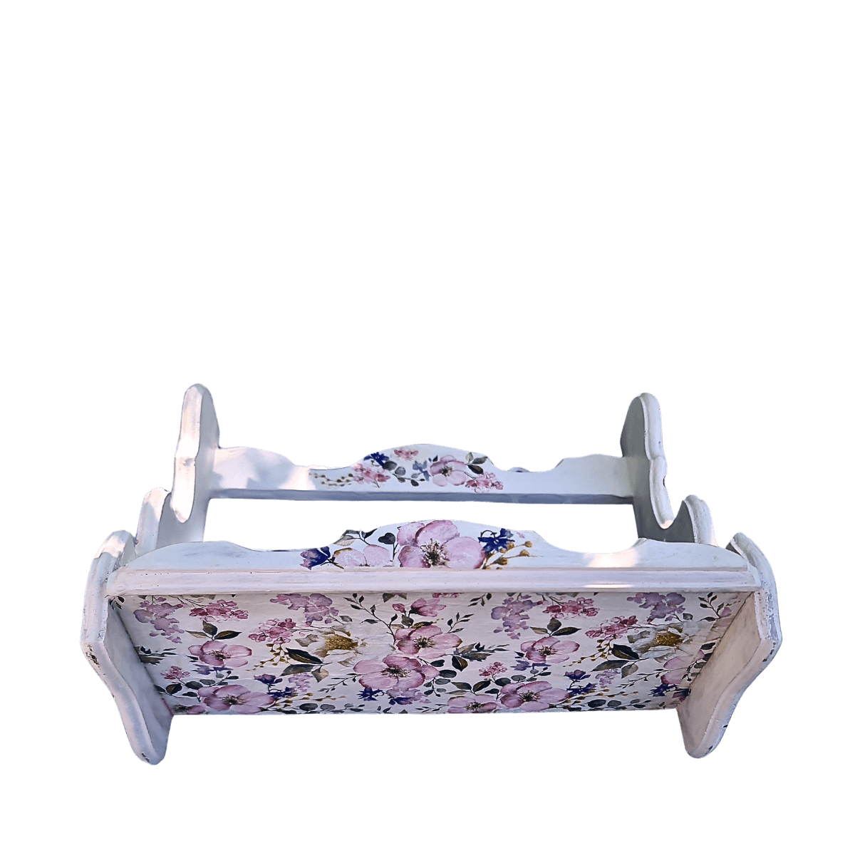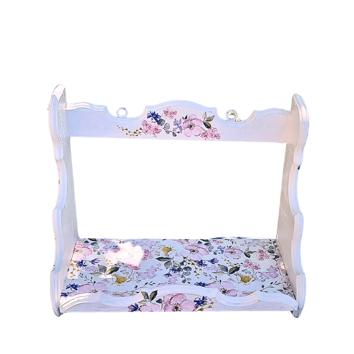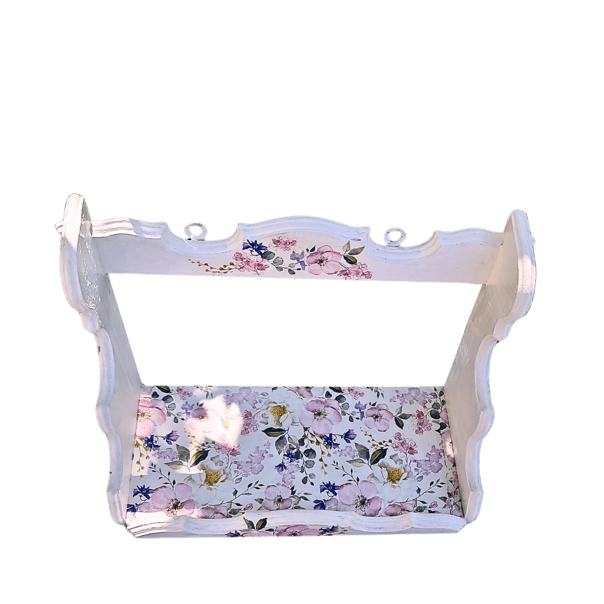 Ova ručno izrađena kuhinjska polica nosi duh Cvetane – arhaične elegancije i prirodne lepote. Dekupaž tehnika sa nežnim floralnim motivima u nijansama roze i zelene unosi toplinu, dok ukrasne ivice dodaju sofisticiranost i čine je posebnom.