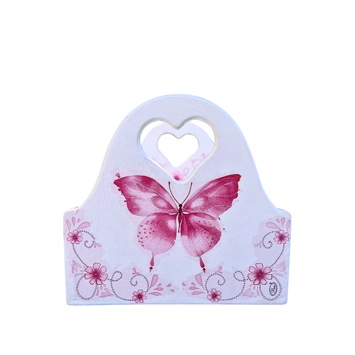 Ovaj mali ručno izrađeni poslužavnik sa nežnim motivima leptira donosi spoj romantike i tradicije u vaš dom. Elegantne ručke sa prorezima u obliku srca i ručno oslikani cvetni detalji čine ga pravim ukrasom i funkcionalnim dodatkom za vaš sto.