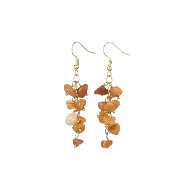 Ručno oblikovani kamenčići vise u obliku grozda, kreirani od pažljivo biranih prirodnih i sintetičkih kristala, zakačeni na elegantnu bazu od zlatnog 304 nerđajućeg čelika. Dužina od 58–60 mm i širina 12–16 mm daju idealnu dinamiku – ni previše, ni premalo.