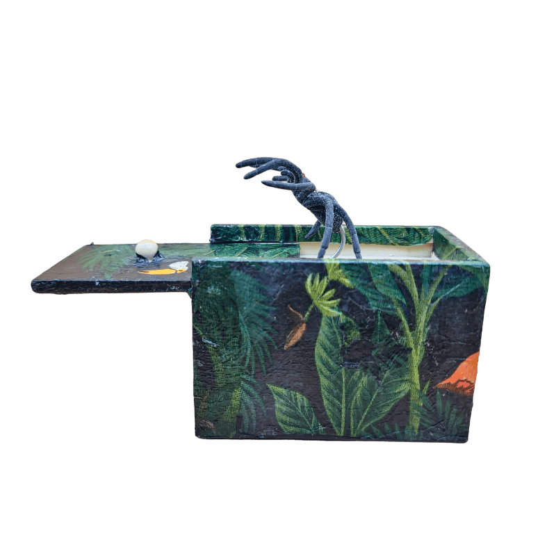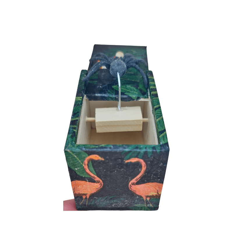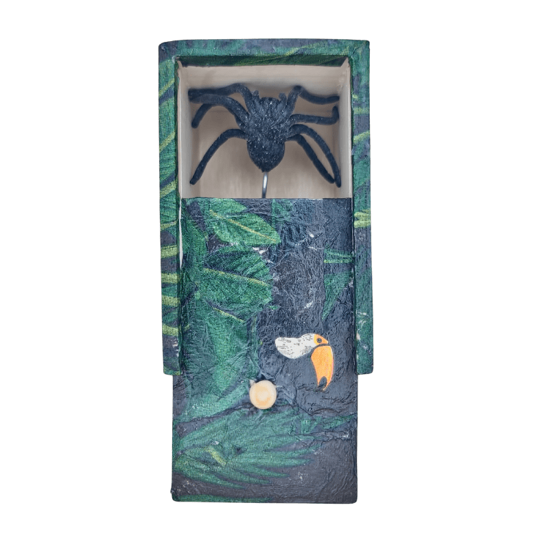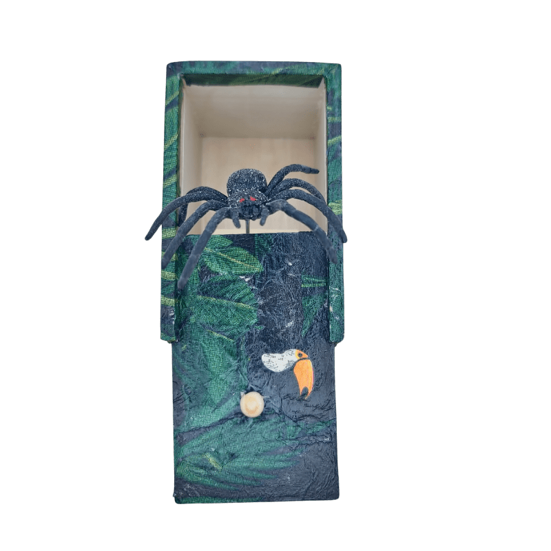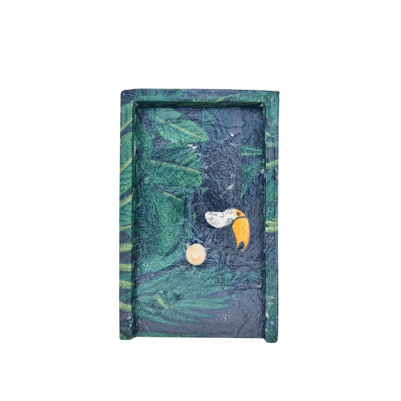Ova drvena kutija ručno je oslikana dekupaž tehnikom, sa motivima gustih amazonskih biljaka, tropskih ptica i tekstura prirode koje oživljavaju svaku ivicu. Ali to nije obična kutija.
