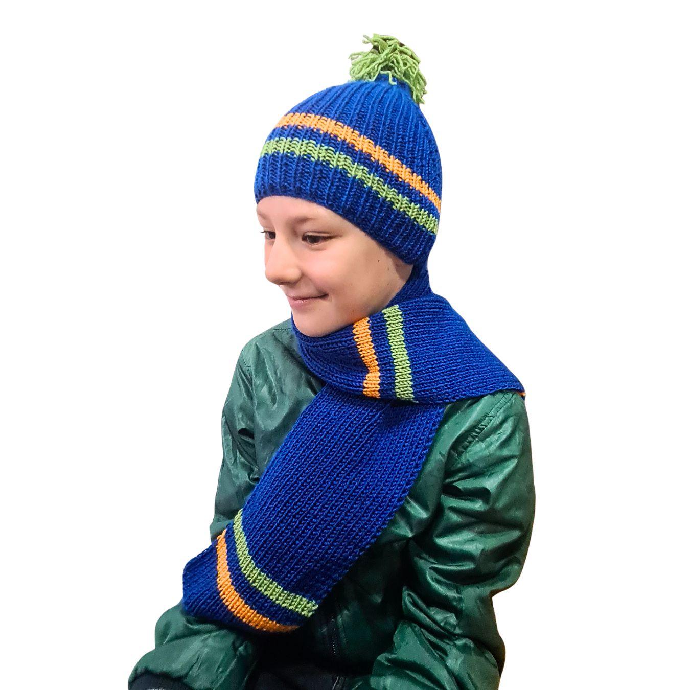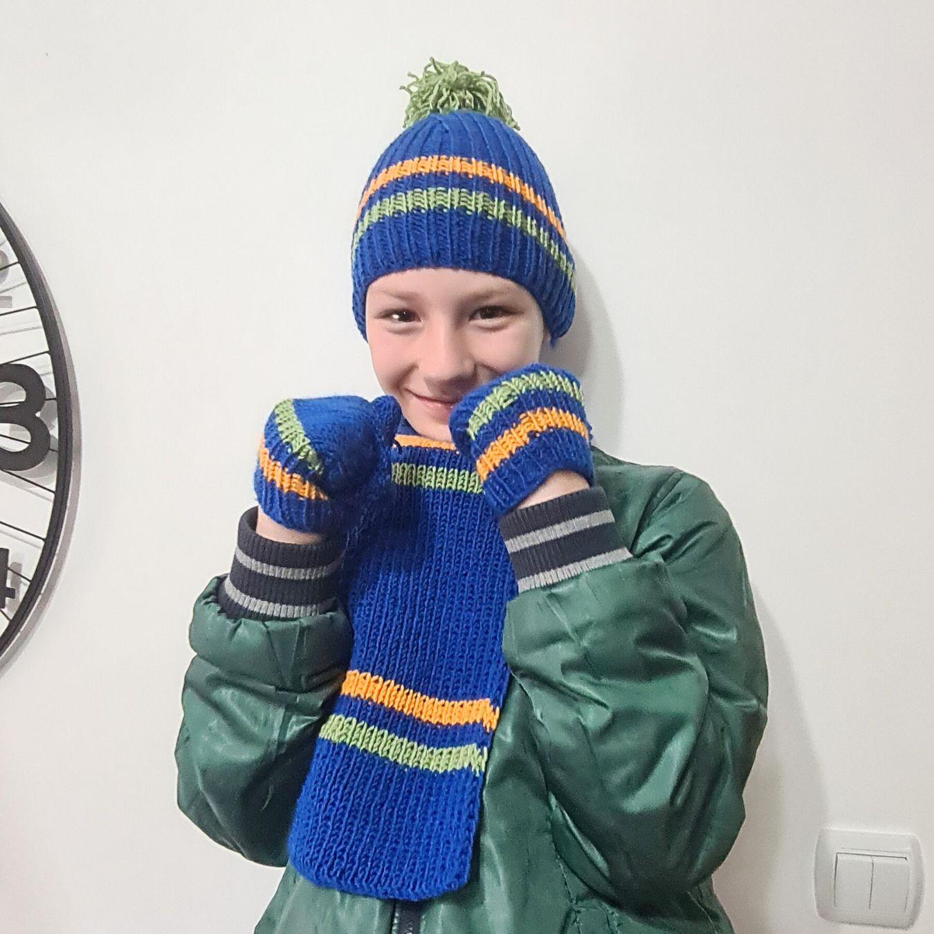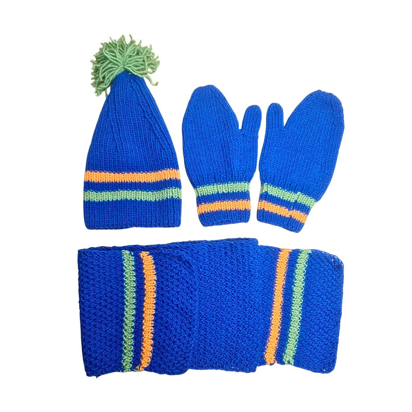 Komplet se sastoji od kape sa pomponom, šala i rukavica, ručno pletenih od kvalitetne vune, prijatne na dodir i prilagođene dečijoj koži. Dizajn sa prugama u kontrastnim bojama daje vedrinu i razigranost, dok osnovna plava nijansa simbolizuje sigurnost, stabilnost i snagu.