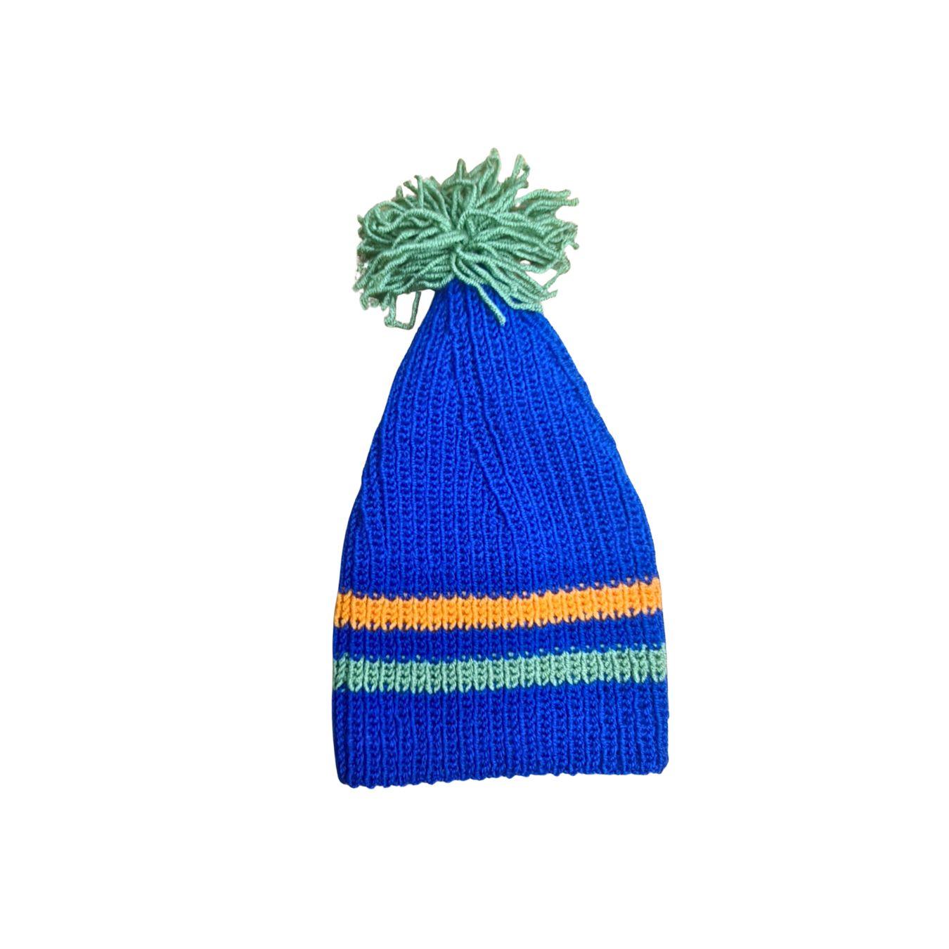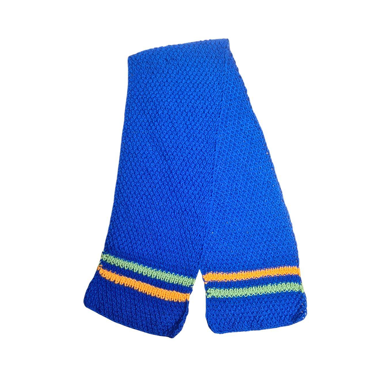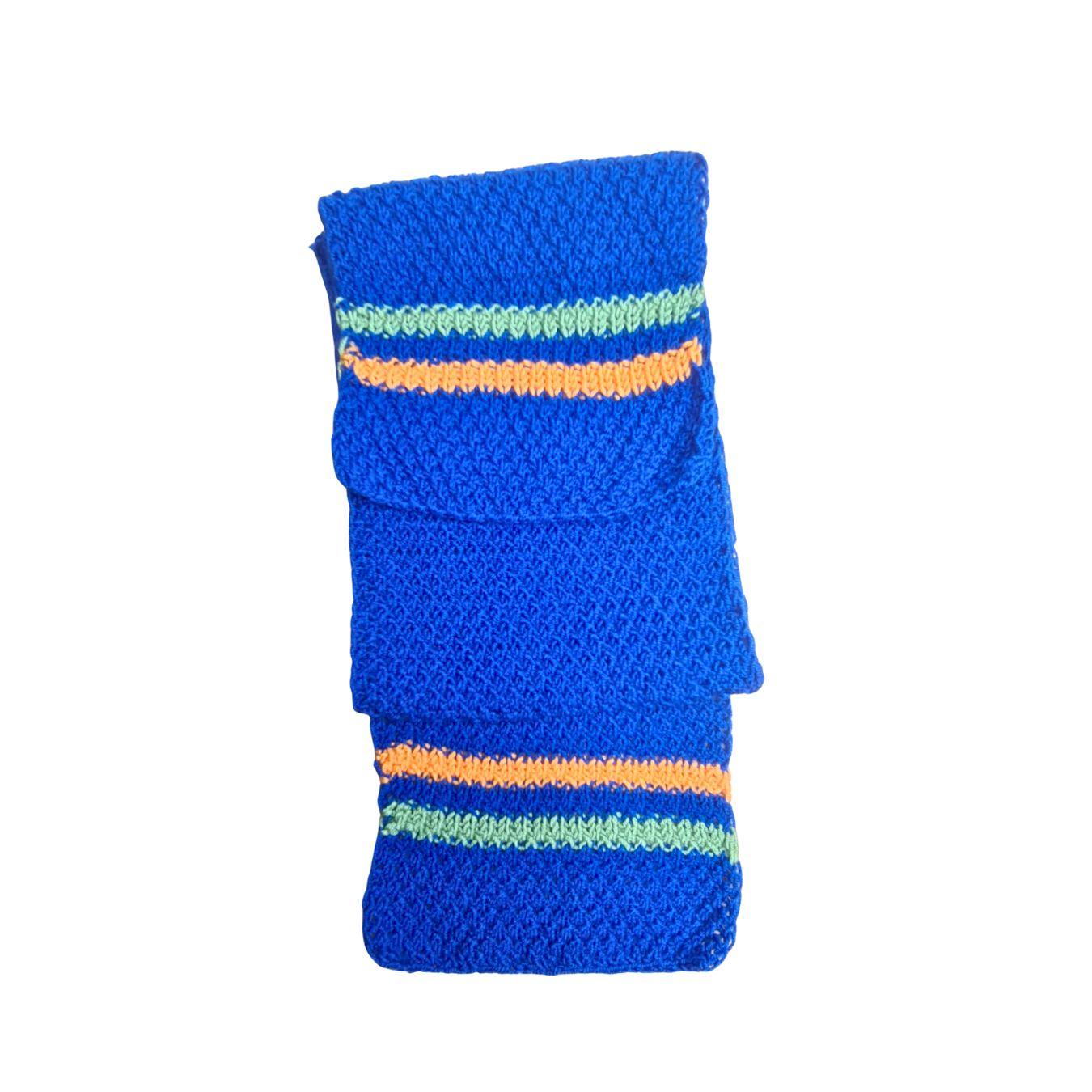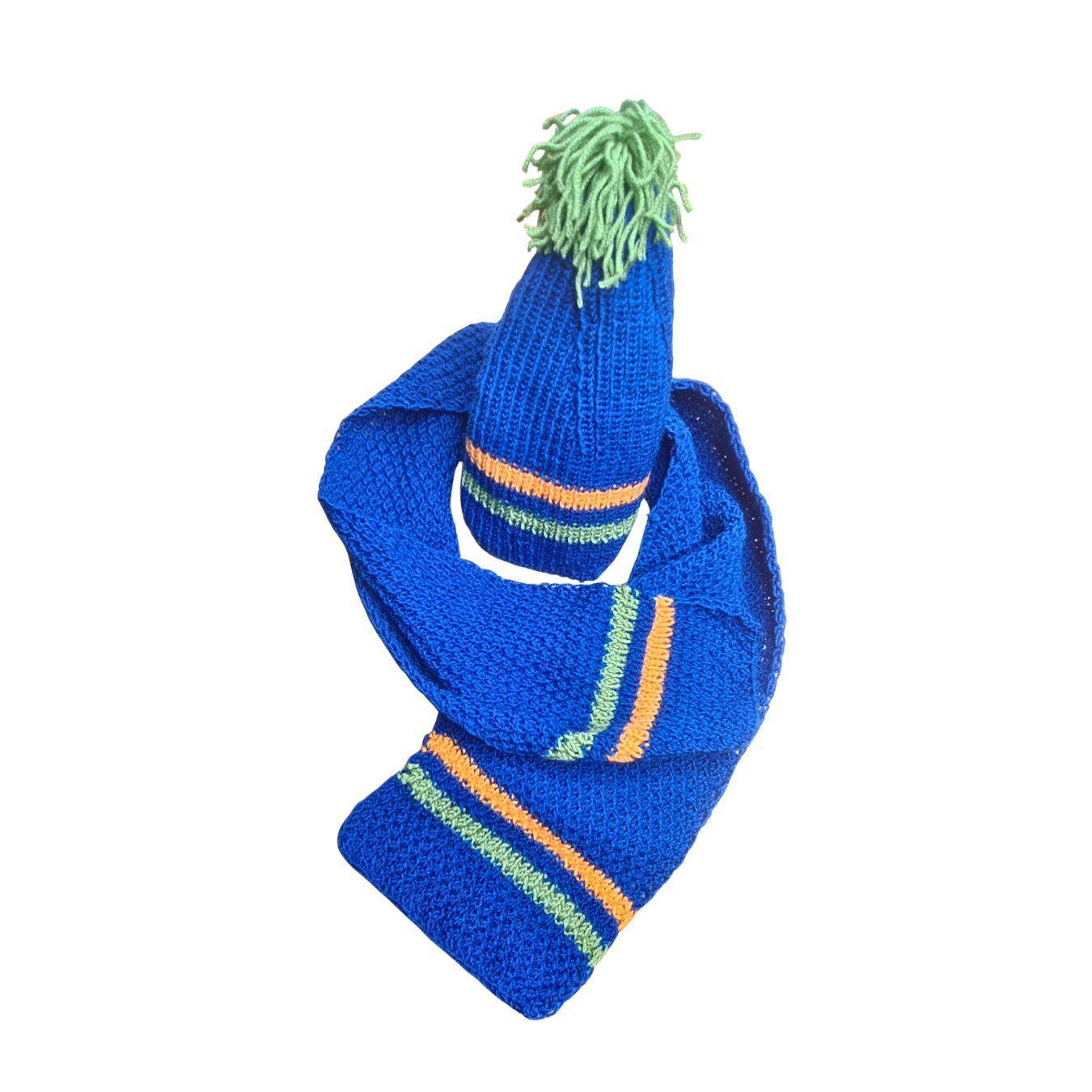 Komplet se sastoji od kape sa pomponom, šala i rukavica, ručno pletenih od kvalitetne vune, prijatne na dodir i prilagođene dečijoj koži. Dizajn sa prugama u kontrastnim bojama daje vedrinu i razigranost, dok osnovna plava nijansa simbolizuje sigurnost, stabilnost i snagu.